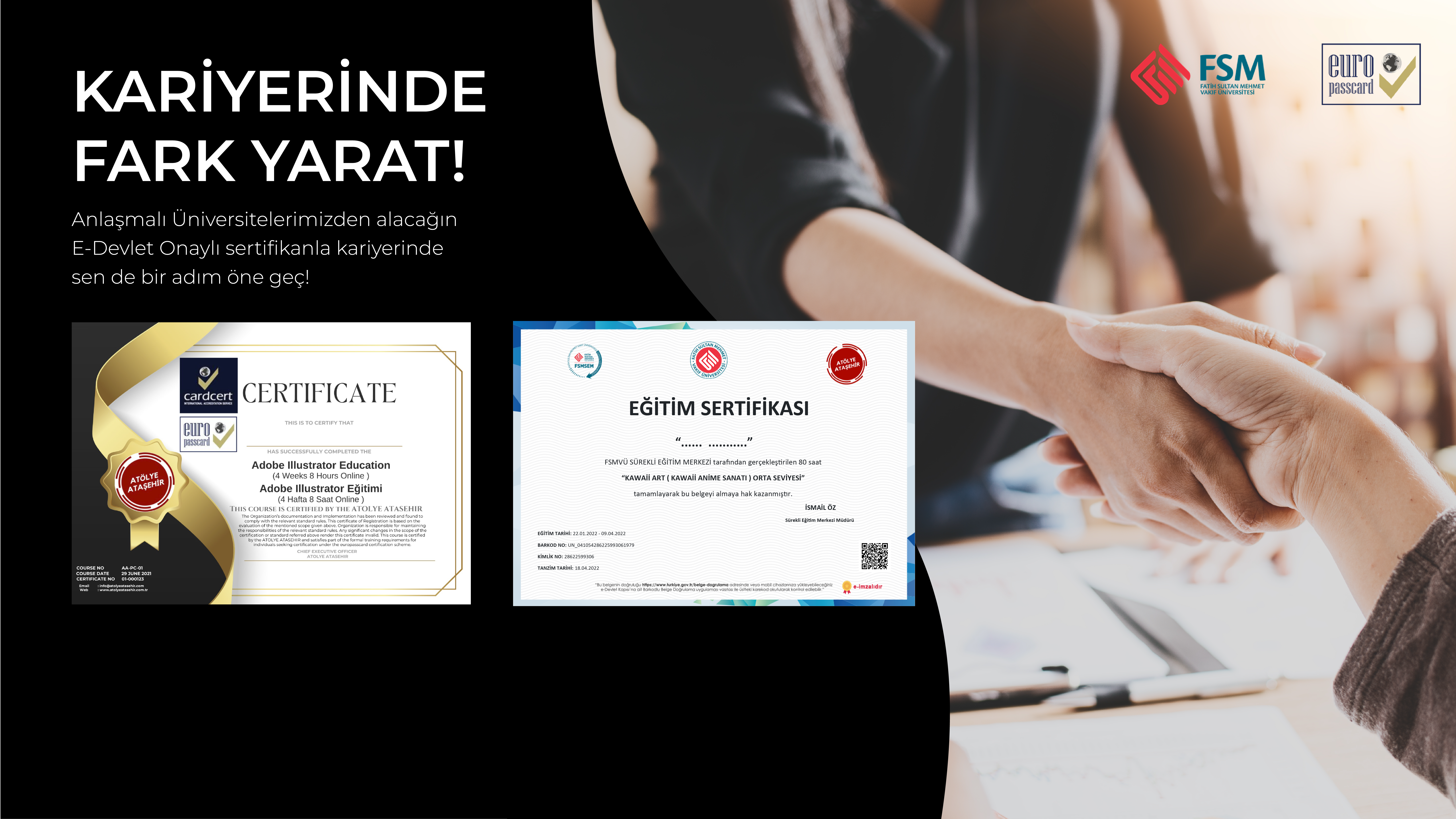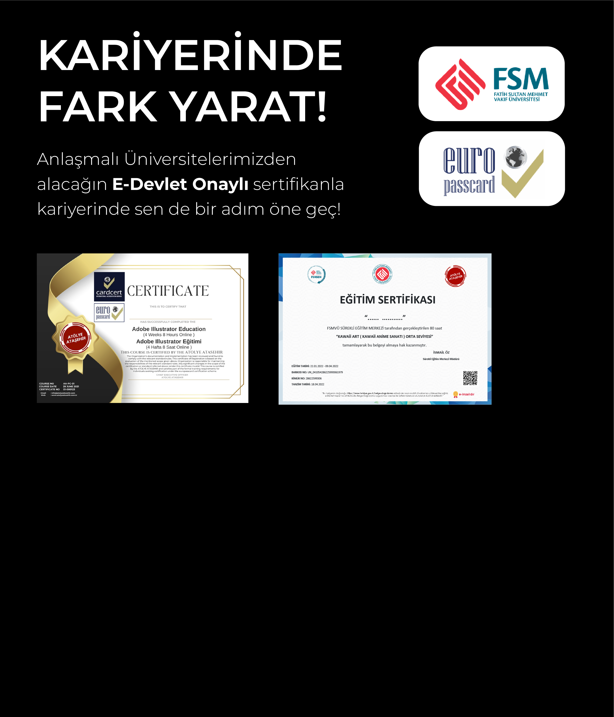 Sertifikalı eğitim programlarımızın sonunda isteğe bağlı olarak resmi eğitim belgelerimiz ile birlikte vereceğimiz EuroPass CardCert Elektronik Sertifika ve Akıllı Kimlik Kartı ile katılımcılarımız tarafımızdan edindikleri tüm eğitim belgelerini “Tek Kartla Tüm Dünyada” izlenebilirliğini “çevrimiçi (online)” sağlayarak, EuroPass CardCert uluslararası belgelendirme kayıtlı Elektronik Sertifika ve Akıllı Kimlik Kartı olarak yanlarında taşıyarak kullanabileceklerdir.