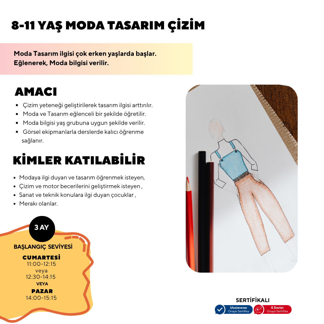 Genel Bilgi:Ders süresince katılımcılar yaş skalasına uygun temel moda ve aksesuar tasarım eğitimi ile geleceğin moda tasarımcıları olma yolunda ilk adımları atacaklardır.