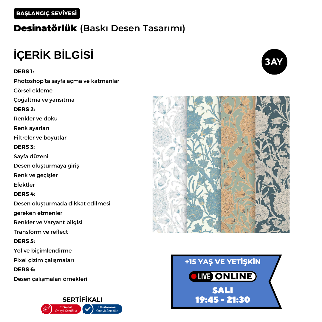 Tekstil sektörünün en gerekli mesleklerinden biri olan desinatörlerin ne iş yaptıklarına yönelik mesleki bilgidir. Katılımcıların, bu mesleği doğru şekilde icra edildiğini öğrenmektedirler. Desinatörlük eğitimi, desinatörün farklı iş alanlarında yer almasını destekleyici ders içeriklerine sahiptir. Ders; tekstil ve tasarımın nasıl birleştiğini ve bir meslek olarak nasıl icra edildiğini katılımcılara anlatılır. Ders sürecinde, bilgisayar destekli tasarım aracılığıyla tekstil malzemelerin nasıl tasarlandığı iletilir. Katılımcılar, edindikleri bilgiler eşliğinde tekstil sektörünün en önemli mesleklerinden birini tanıyarak mesleğe adım atma yolunu açarlar.