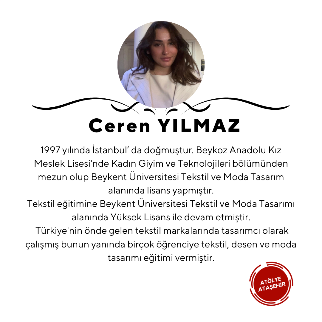 1997 yılında istanbul’ da doğmuştur. Beykoz Anadolu kız meslek lisesinde kadın giyim ve teknolojilerin den mezun olup Beykent üniversitesi Tekstil ve Moda Tasarım alanında lisans yapmıştır. Tekstil eğitimine Beykent üniversitesi Tekstil ve Moda Tasarımı alanında Yüksek Lisans ile devam etmiştir. Türkiyenin önde gelen tekstil markalarında tasarımcı olarak çalışmış bunun yanında birçok öğrenciye tekstil,desen ve moda tasarımı eğitimi vermiştir.