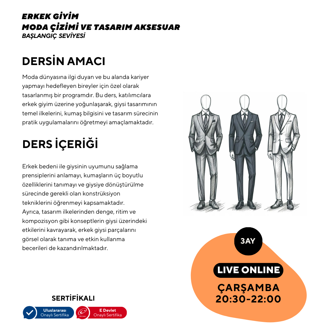Moda dünyasına ilgi duyan ve bu alanda kariyer yapmayı hedefleyen bireyler için özel olarak tasarlanmış bir programdır. Bu ders, katılımcılara erkek giyim üzerine yoğunlaşarak, giysi tasarımının temel ilkelerini, kumaş bilgisini ve tasarım sürecinin pratik uygulamalarını öğretmeyi amaçlamaktadır.