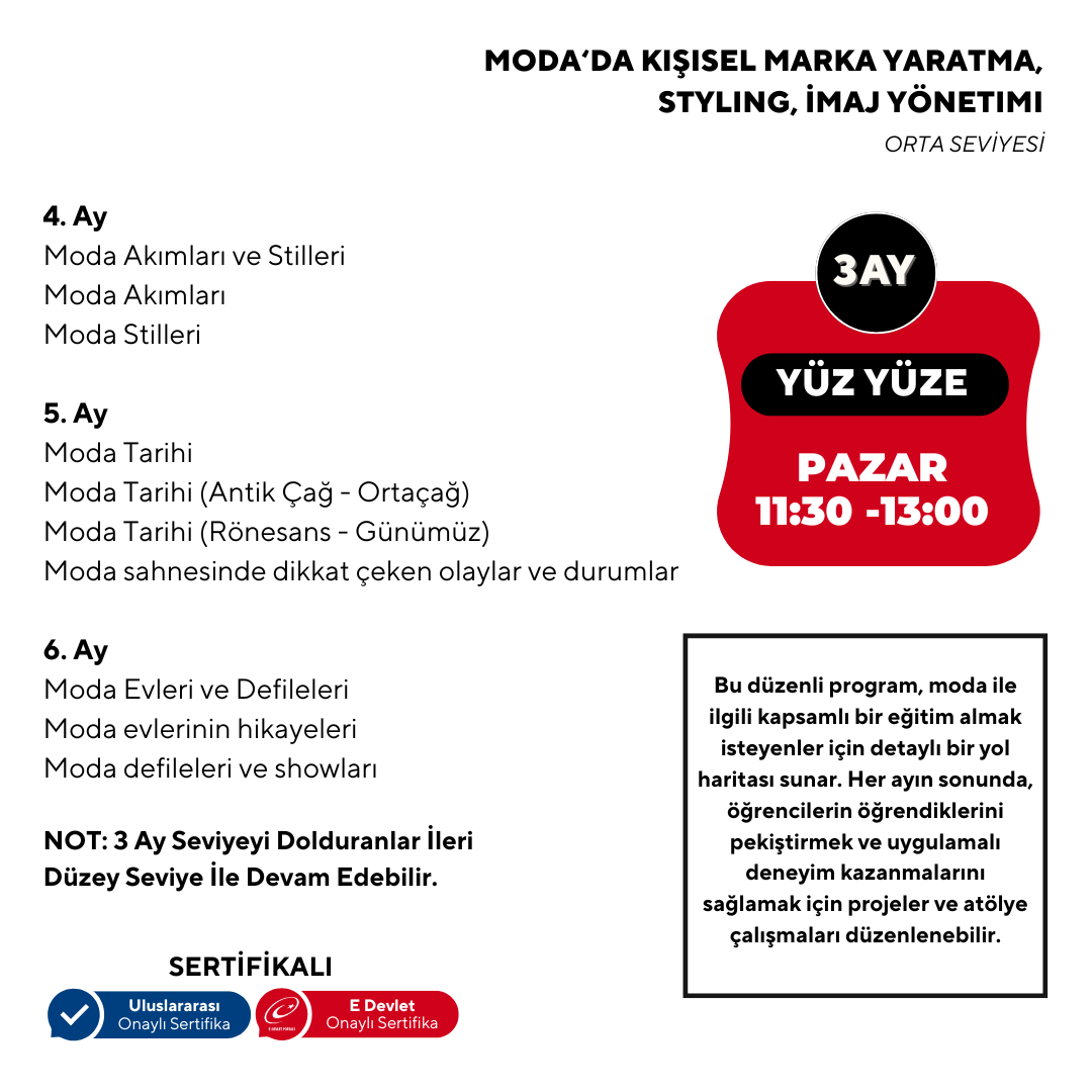 Bu düzenli program, moda ile ilgili kapsamlı bir eğitim almak isteyenler için detaylı bir yol haritası sunar. Her ayın sonunda, öğrencilerin öğrendiklerini pekiştirmek ve uygulamalı deneyim kazanmalarını sağlamak için projeler ve atölye çalışmaları düzenlenebilir.