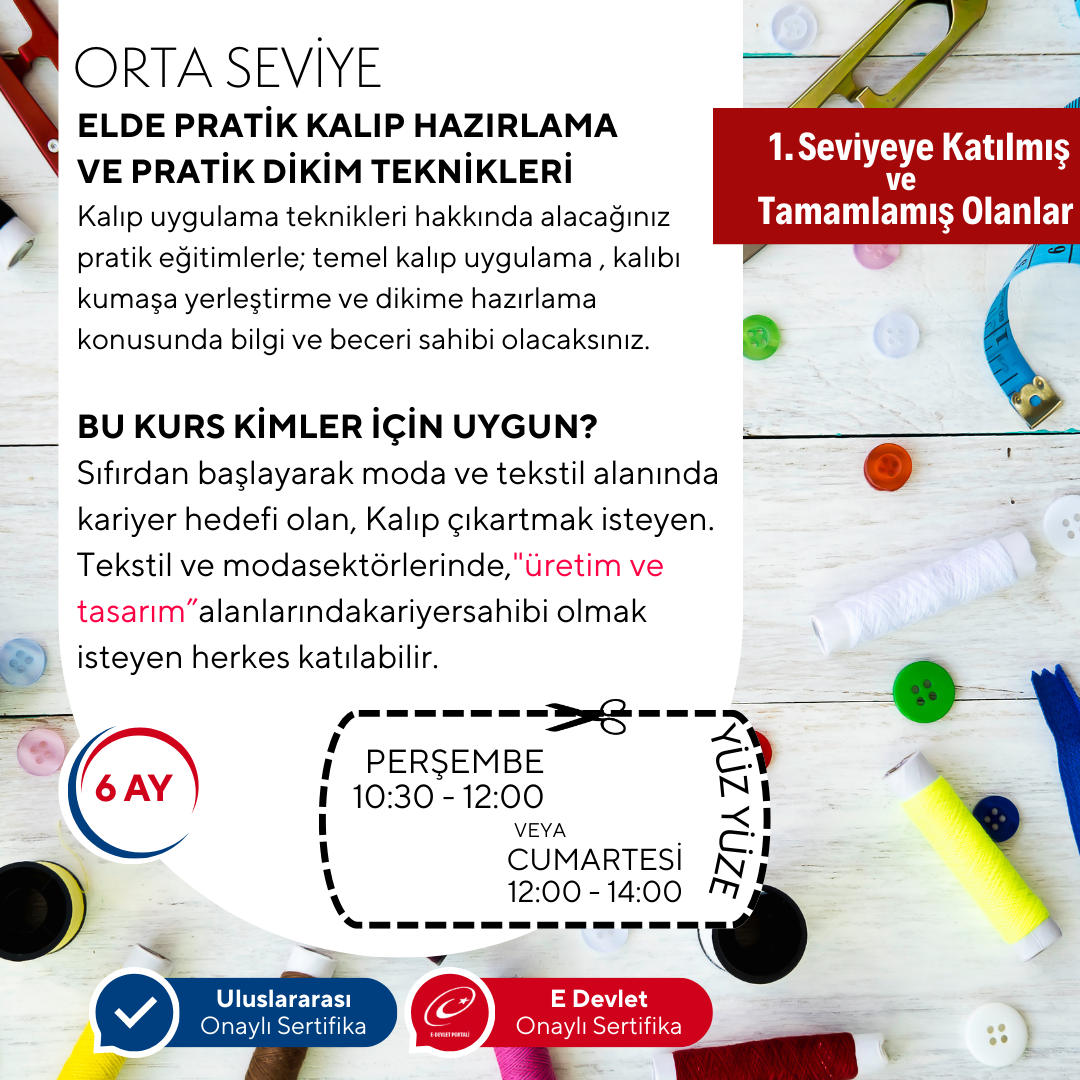 Kalıp uygulama teknikleri hakkında alacağınız pratik eğitimlerle; temel kalıp uygulama , kalıbı kumaşa yerleştirme ve dikime hazırlama konusunda bilgi ve beceri sahibi olacaksınız.