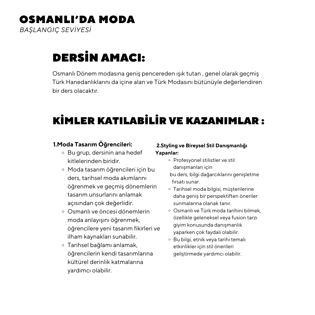 Osmanlı Dönem modasına geniş pencereden ışık tutan, genel olarak geçmiş Türk Hanedanlıklarını da içine alan ve Türk Modasını bütünüyle değerlendiren bir eğitim olacaktır.