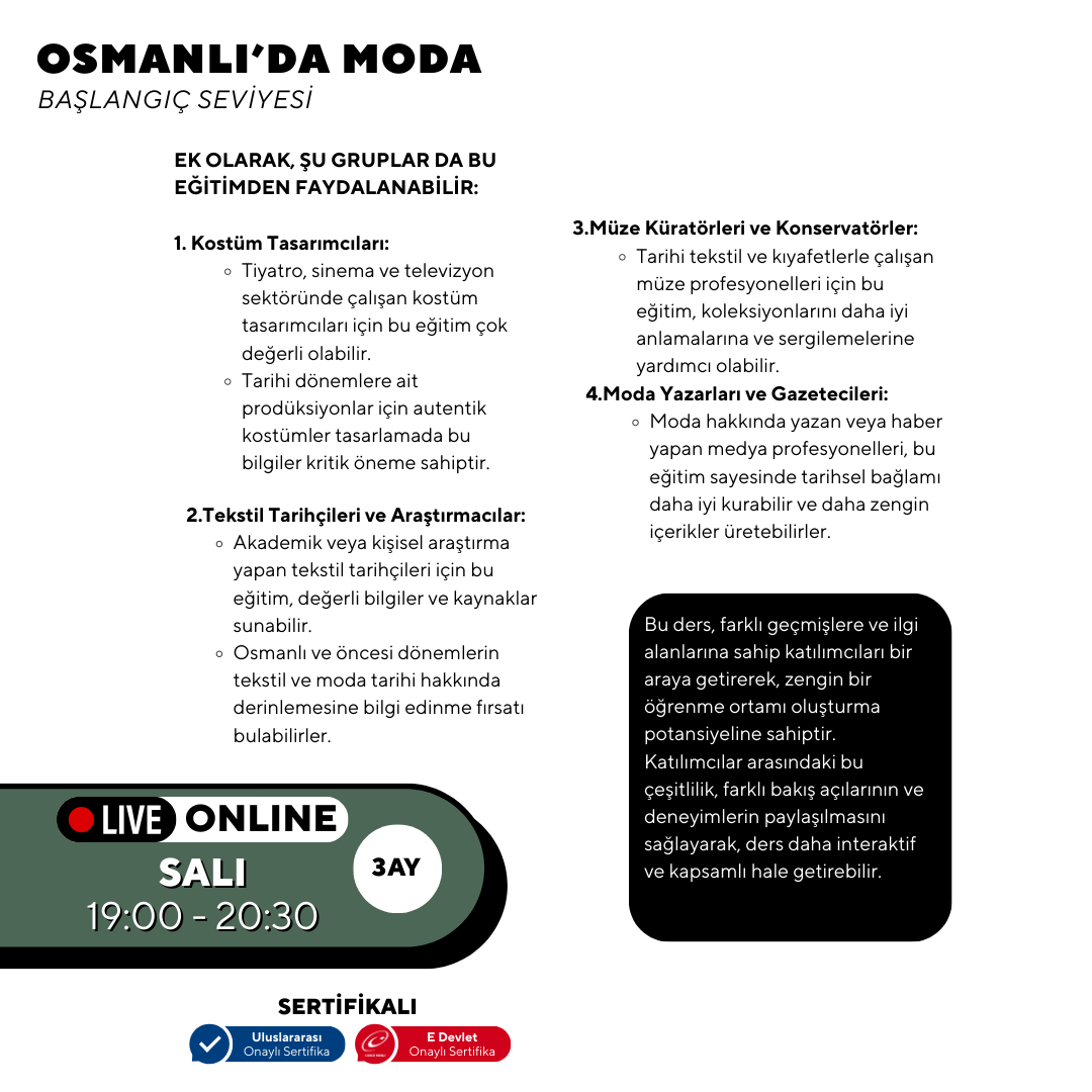 · Tarih meraklıları için bu eğitim, moda perspektifinden Türk ve dünya tarihini öğrenme fırsatı sunar.